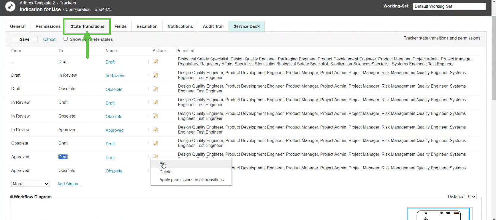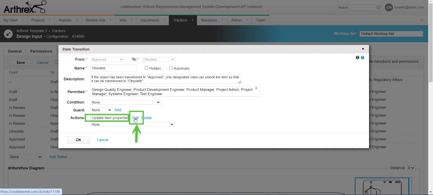 For the Approved to Obsolete transition, click on the three dots and click on the Edit button.