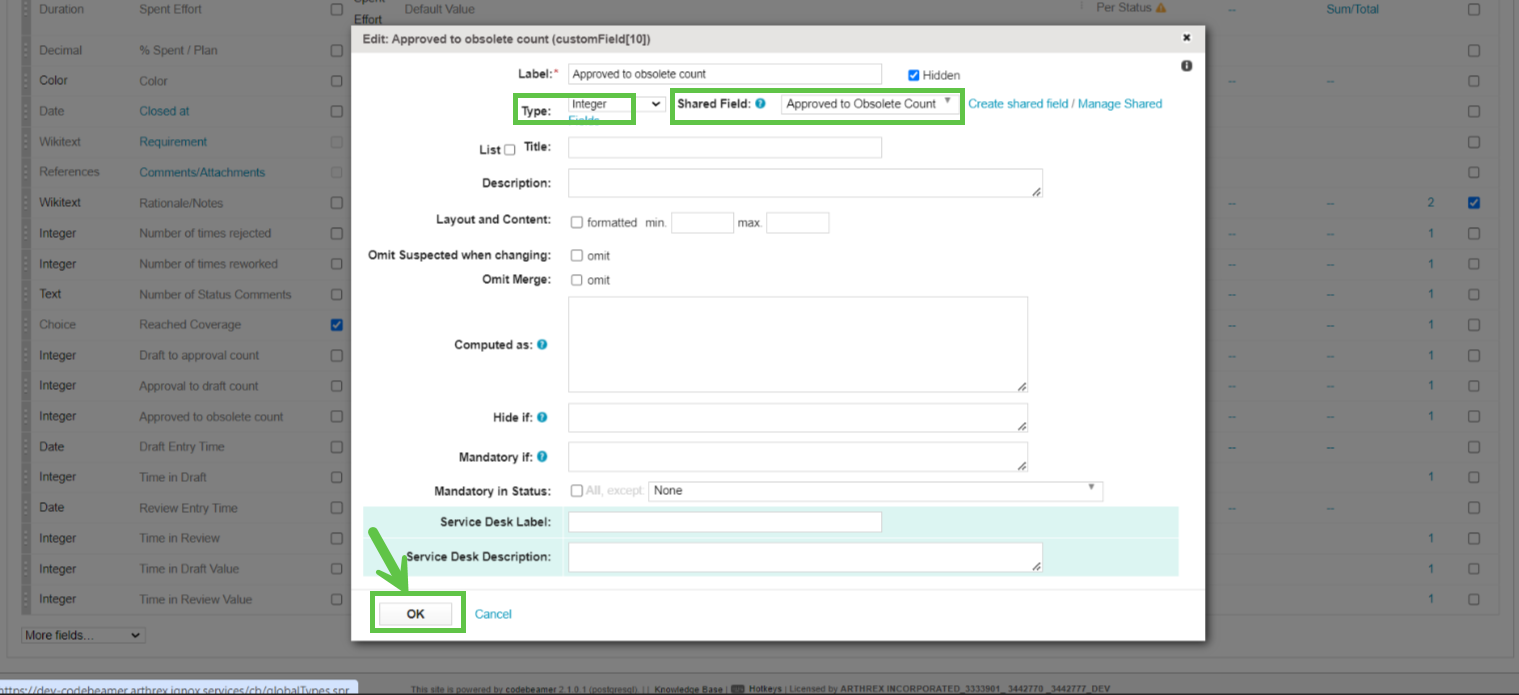Keep Type as 'Integer' and Shared Field as 'Approval to Obsolete count' and click OK.