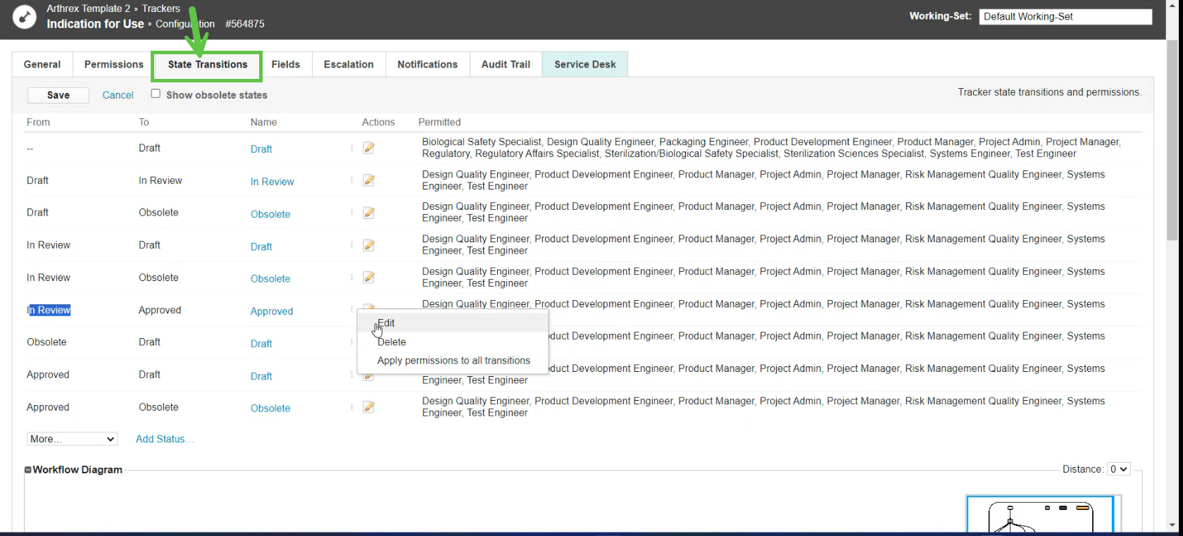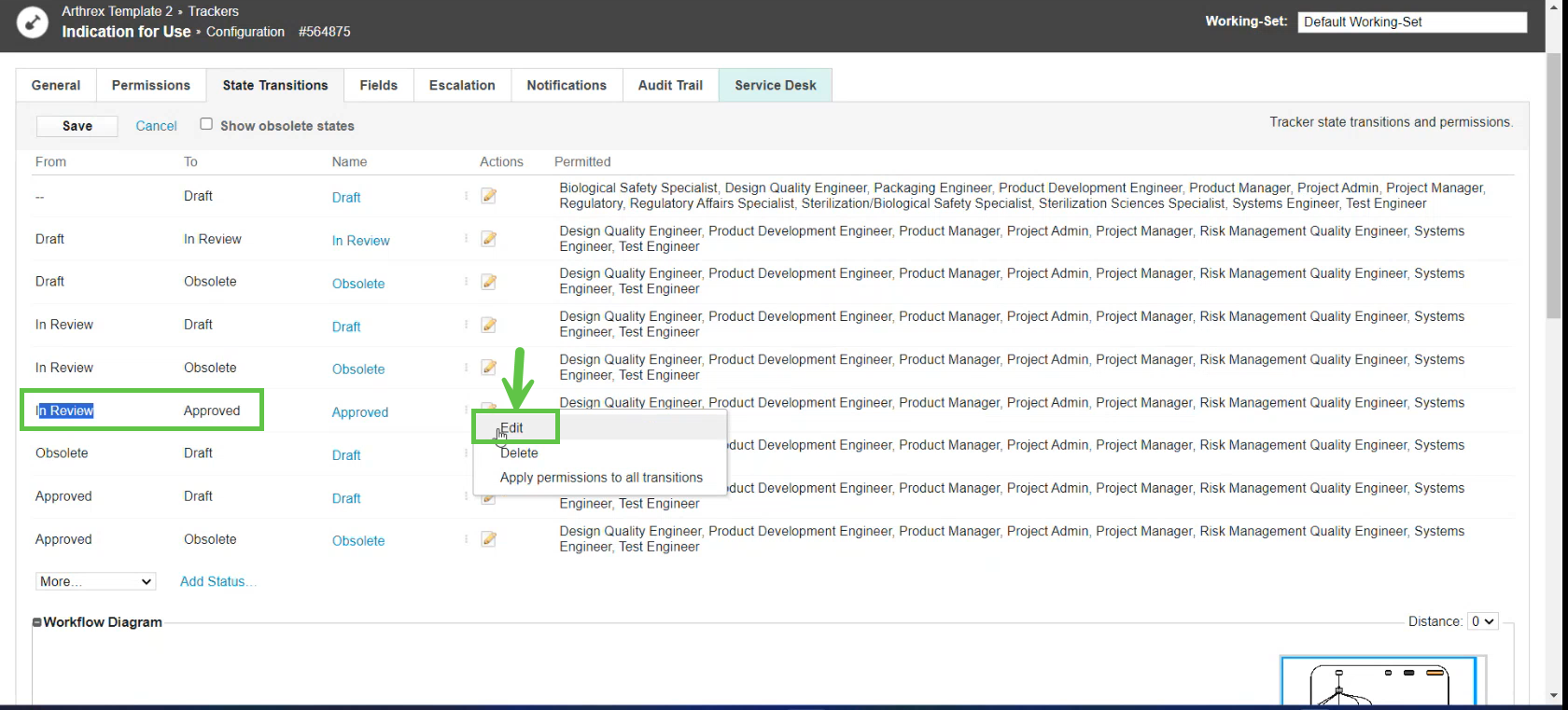 For the In Review to Approved transition, click on the three dots and click on the Edit button.