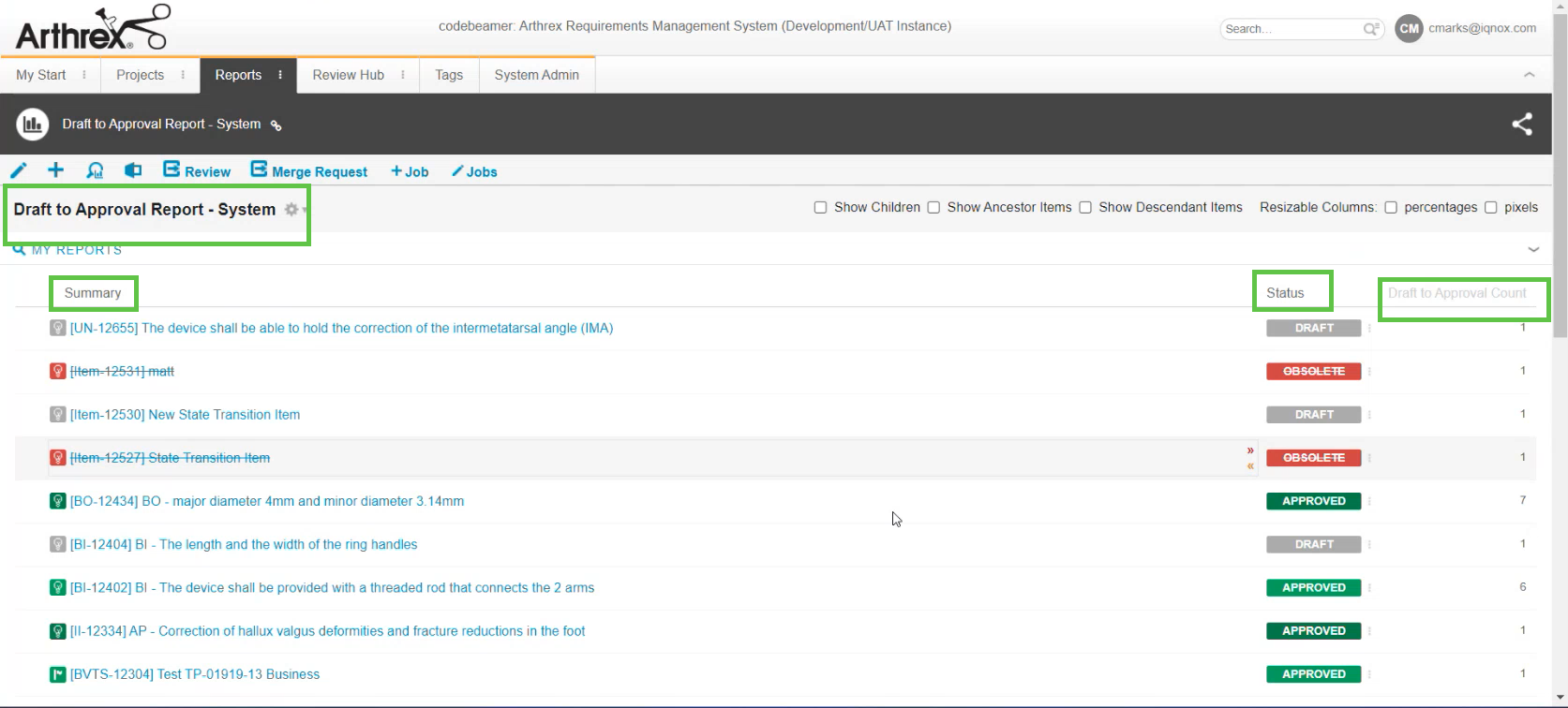 There will be 3 columns in the report: - Summary, Status, and Draft to Approval Count (hidden field).