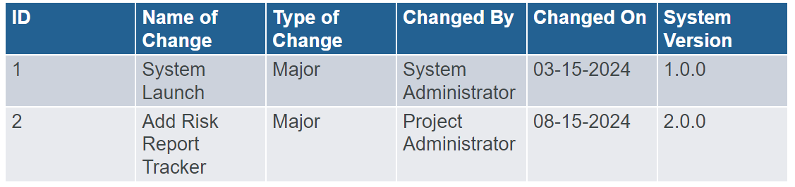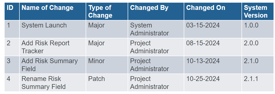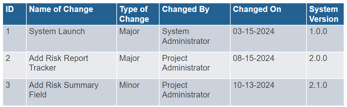 Problem Statement: Project Administrator wants to update the system version from 2.0.0 to 2.1.0. This would be prompted by adding a new field, called Risk Summary to the existing Risk Report tracker (considered a minor update).