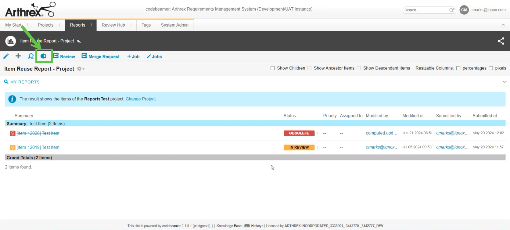 Select the System-specific report Item Reuse Report - System. This way you can configure all the projects at once.