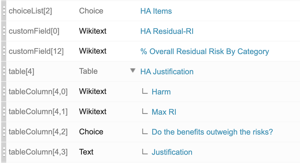 Note that when you save the "risk-assessment-elements" in the application configuration, codebeamer will translate the list into the following structure: